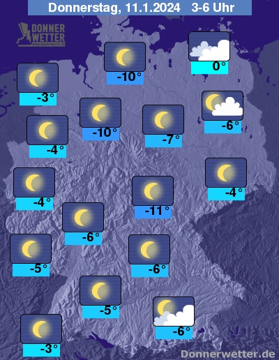 Die Temperaturen gehen in den frühen Morgenstunden zurück auf Werte um -11 Grad im Thüringer Wald und 0 Grad auf Usedom.