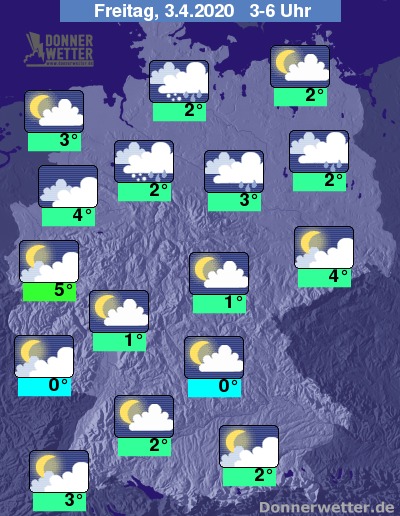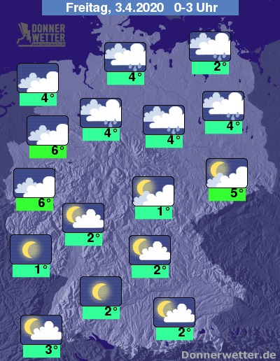 In der Nacht auf Freitag ist der Himmel über der Nordhälfte Deutschlands bedeckt, an den Küsten später auflockernd, und immer wieder muss mit Schauern gerechnet werden. Im höheren Bergland fällt auch Schneeregen oder Schnee. In den übrigen Landesteilen überwiegt eine Mischung aus lockerer und aufgelockerter Bewölkung und es bleibt meist trocken.