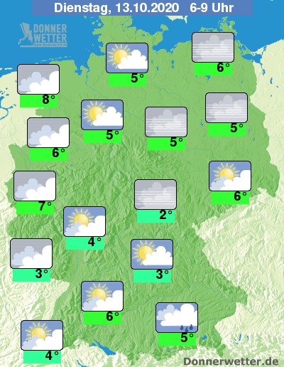 Der Dienstag startet zwischen Oberrhein und Ostfriesland mit einer meist geschlossenen Wolkendecke. Im restlichen Teil gibt es in den Frühstunden einen Mix aus Sonne, Wolken und Nebel- oder Hochnebel. Es bleibt trocken.