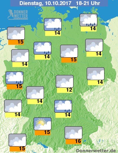 Heute Abend ziehen verbreitet dichte Wolken übers Land hinweg, Auflockerungen sind hier und da, vor allem allem jedoch im Süden möglich. Im Norden und Nordosten bilden sich zeitweise Schauer, sonst bleibt es bis auf seltene Schauer trocken. Die Temperatur liegt bei 12 bis 16 Grad.