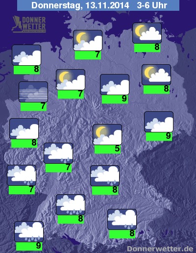 In der kommenden Nacht klingt der Regen im Nordwesten des Landes meist rasch ab, dazu bleibt es jedoch meist stark bis dicht bewölkt. In der Südhälfte von Deutschland hält sich eine weitgehend dichte Wolkendecke, aus der zeitweise Regen fällt, sonst ist es größtenteils stark, teils auch aufgelockert bewölkt und trocken. Im Westdeutschland kann sich gebietsweise Nebel oder Hochnebel entwickeln. Die Temperatur sinkt auf 9 Grad in Magdeburg und bis 5 Grad im Steigerwald.