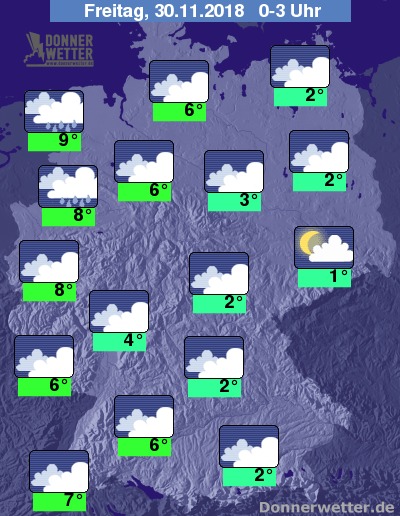 In der Nacht auf Freitag bleibt der Himmel über weiten Landesteilen stark bewölkt oder bedeckt. Regionale Schauer sind zunächst im Nordwesten, später dann im Nordosten des Landes unterwegs.