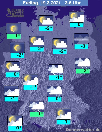 In der Nacht auf Freitag zeigt sich der Himmel über der Nordhälfte des Landes zunächst noch wechselnd oder stark bewölkt, in den frühen Morgenstunden lockert es hier dann zunehmend auf; im Nordwesten funkeln die Sterne auch von einem wolkenlosen Himmel. In der Südhälfte des Landes bleibt es meist wolkenverhangen und vor allem in den südöstlichen Landesteilen fällt gebietsweise Schneeregen oder Schnee.
