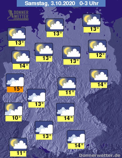 Der Feiertag startet über weiten Landesteilen teils heiter bis wolkig, teils aufgelockert bewölkt. Dichter bewölkt bleibt es in den Frühstunden im Fichtelgebirge sowie im Südwesten. Zwischen Breisgau und Saar fällt dabei auch immer wieder Regen.
