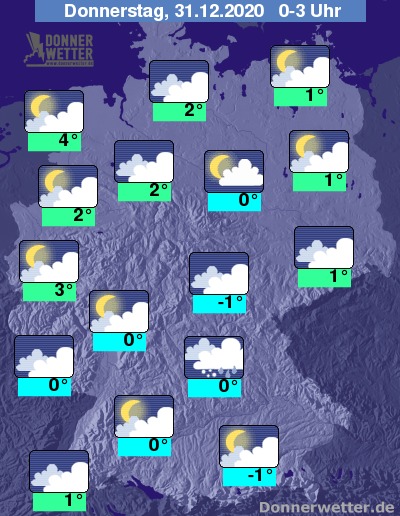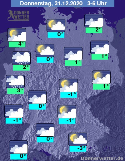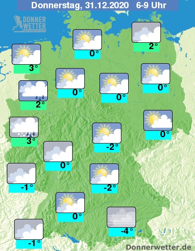 Der Silvestertag startet über der Westhälfte mit meist bedecktem Himmel, von dem zeitweise auch Regen-, Schneeregen- oder Schneeschauer niedergehen können. In den übrigen Landesteilen bleibt es bei aufgelockerter Bewölkung meist trocken.