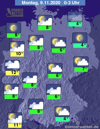In der Nacht auf Montag zeigt sich der Himmel über weiten Landesteilen wechselnd oder stark bewölkt, einen Mix aus Nebelfeldern und Sternen gibt es noch im Umfeld der Küsten. Im Westen kann es zeitweise etwas tröpfeln, sonst bleibt es meist trocken.