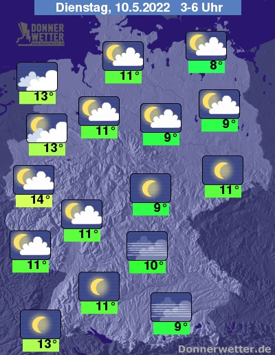 In der kommenden Nacht bleibt es über der Südosthälfte des Landes verbreitet sternenklar. Im übrigen Land ziehen aus Nordwesten mehr und mehr und im Nordwesten dann auch dichte Wolken auf, dazu bleibt es aber trocken. Die Temperatur sinkt auf 14 Grad in Bonn und 8 Grad in Neubrandenburg.