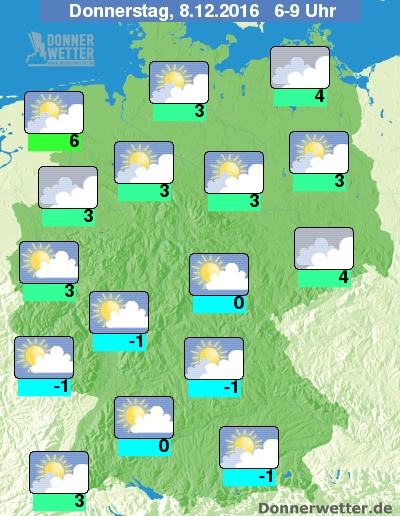 Die Höchsttemperatur in Deutschland am Donnerstagmorgen liegt bei 6 Grad C an der Nordsee und - 1 Grad C im Sauerland.