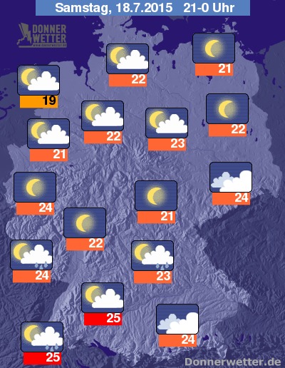 Heute Abend bilden sich in Süddeutschland gebietsweise Schauer und auch Gewitter, im übrigen Bundesgebiet zeigt sich der Himmel hingegen meist locker bewölkt oder sternenklar, im Osten halten sich aber auch dichte Wolken, dazu bleibt es trocken. Die Abendtemperatur liegt bei 25 Grad in Freiburg und um 19 Grad in Ostfriesland.