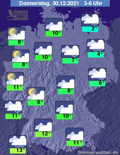 In der bevorstehenden Nacht bleibt es zunächst verbreitet dicht bewölkt und vor allem nach Osten hin fällt noch vielerorts Regen der zum Morgen hin nachlässt. Nach Westen hin bleibt es hingegen meist trocken. Im Laufe der Nacht lockert der Himmel im Westen und Nordwesten gebietsweise auf, dazu bleibt es hier trocken. Im Südwesten zieht dagegen bei dichten Wolken neuer Regen auf. Die Tiefstwerte liegen bei 13 Grad in Freiburg und etwa 2 Grad in Neubrandenburg.