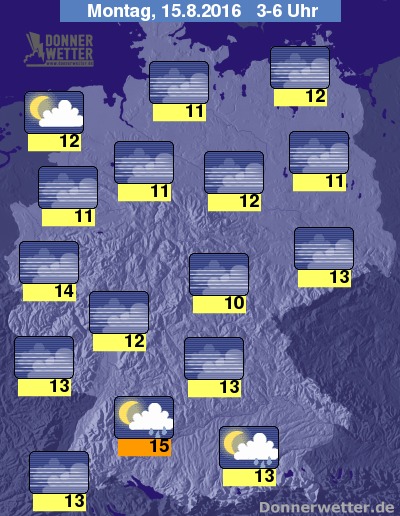 In der folgenden Nacht zeigt sich der Himmel über dem Land verbreitet sternenklar, hier und da bildet sich Dunst. Im Alpenvorland ist es jedoch oft aufgelockert bis stark bewölkt und es können sich Schauer und auch einzelne Gewitter entwickeln. In den anderen Landesteilen bleibt es trocken. Die Temperatur sinkt auf 15 Grad in Karlsruhe und bis 10 Grad im Eichsfeld.