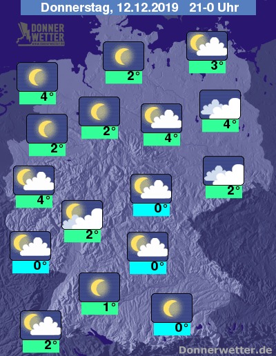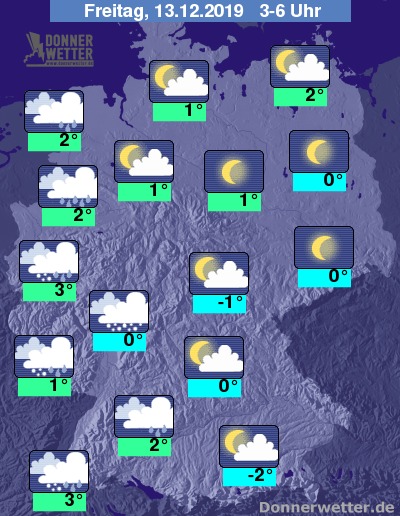 Während der zweiten Nachthälfte verdichtet sich die Wolkendecke im Westen und es setzen Niederschläge ein, die anfangs zum Teil bis in tiefere Lagen als Schnee oder Schneeregen fallen und gefährliche Straßenglätte auslösen können. In den anderen Gebieten bleibt es zunächst klar oder nur locker bewölkt.