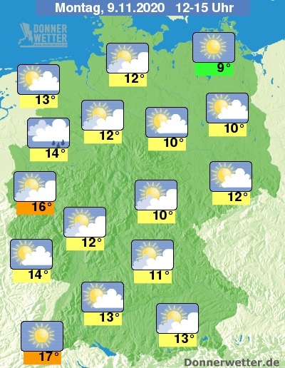Im Nachmittagsverlauf machen die Wolken im Süden des Landes immer häufiger der Sonne Platz; im norddeutschen Tiefland ist der Himmel teils heiter bis wolkig, teils aufgelockert bewölkt.