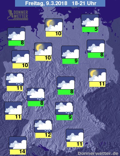 In der Nacht zum Samstag halten sich verbreitet dichte Wolken, dazu bleibt es im Alpenvorland und im Nordosten des Landes trocken, sonst fällt hingegen zeitweise Regen. Die Temperatur sinkt auf 9 Grad im Breisgau und bis 0 Grad in Vorpommern.