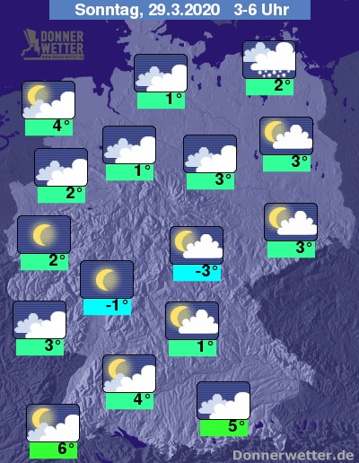 In der Nacht zum Sonntag ziehen von Norden her immer dichtere Wolken in den Norden und bis zum Morgen etwa über die Nordhälfte des Landes, hierbei fällt zeitweise Regen, Schneeregen oder Schnee. Weiter nach Süden ist es meist locker bewölkt oder sternenklar, teils aber auch stärker bewölkt, jedoch weitgehend trocken. Die Temperatur sinkt auf 6 Grad im Oberrheingraben und bis -3 Grad im Eichsfeld.