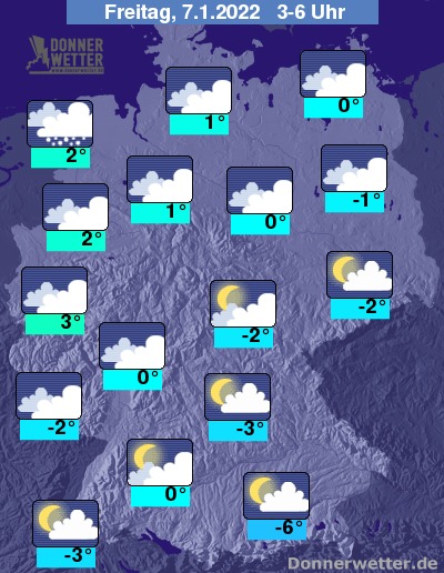 In der Nacht zum Freitag ziehen von Nordwesten her dichte Wolken durch und im Nachtverlauf setzt im Emsland und am Niederrhein Schneefall oder Schneeregen ein. Weiter nach Südosten hin bleibt es noch trocken. Im Süden und Osten ist es zunächst auch noch meist locker bis aufgelockert bewölkt. Die Temperatur sinkt auf 3 Grad in Köln und bis -6 Grad in München. An der Nordsee weht ein stürmischer Wind, zum Teil ist hier auch Sturm möglich.