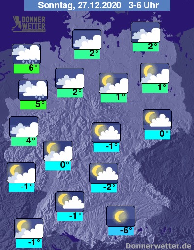 In der Nacht zum Sonntag ist es im Süden anfangs noch oft locker bewölkt oder sternenklar, von Nordwesten her zieht es sich aber zu. Im übrigen Land ist es bereits stark bewölkt und vom Niederrhein bis nach Schleswig-Holstein fällt zeitweise Regen, weiter nach Südosten hin bleibt es hingegen trocken. Die Temperatur sinkt auf 6 Grad in Cuxhaven und bis -6 Grad im Raum München.