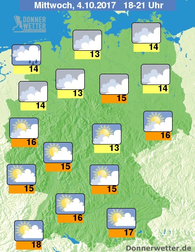 Heute Abend bleibt es im Norden weitgehend stark bewölkt, dazu fällt im Nordseeumfeld auch gebietsweise Regen, sonst ist es hier trocken. Weiter nach Süden hin kann sich zunehmend auch die Sonne durchsetzen, dabei bleibt es trocken. Die Temperatur liegt bei 13 bis 18 Grad.