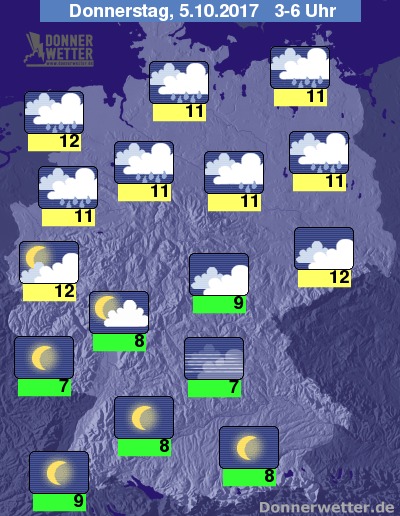 In der Nacht zum Donnerstag ziehen von Norden her dichte Wolken mit zeitweiligem Regen auf, der sich bis zum Morgen etwa auf die Nordhälfte hin ausbreitet. Weiter nach Süden hin ist der Himmel dagegen verbreitet sternenklar und es bleibt trocken. Die Temperatur sinkt auf 12 Grad an der Nordsee und bis 7 Grad im Saargau.