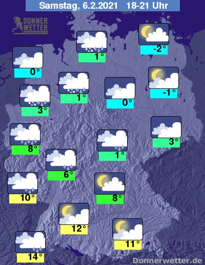 Heute Nachmittag bleibt es in einem breiten Streifen von NRW bis nach Sachsen bedeckt und hier fällt zeitweise Regen, Schneeregen oder Schnee. Im übrigen Bundesgebiet ist es teils stark, teils aufgelockert bewölkt, dabei fällt nur selten etwas Regen, Schneeregen oder Schnee. Die Temperatur steigt auf -2 Grad an der Müritz und bis zu 14 Grad im Breisgau.