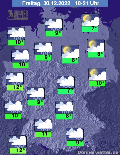 Heute Abend ist es lediglich im Osten und Nordosten noch teils aufgelockert bewölkt, sonst ist es bedeckt und es fällt zum Teil kräftiger Regen. Die Temperatur liegt bei 7 Grad in Vorpommern und bei bis zu 12 Grad entlang des Rheins. Es weht verbreitet starker und vielerorts auch stürmischer Wind mit möglichen Sturmböen. An den Küsten herrscht verbreitet Sturm.