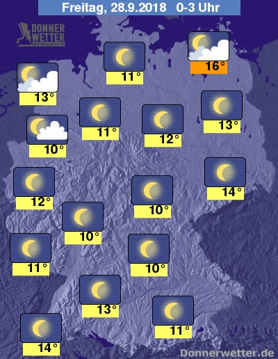 In der Nacht zeigt sich der Himmel zunächst meist sternenklar, an den Küsten bleibt es meist wechselnd oder stark bewölkt. Im weiteren Nachtverlauf nimmt die Bewölkung in der Nordhälfte zu, Schauer sind aber nicht zu erwarten.