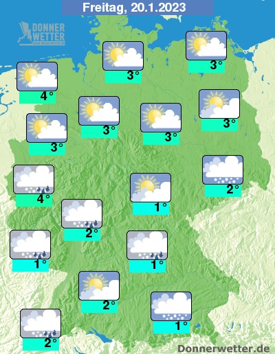 Am Freitag zeigt sich über dem Nordosten und auch über dem Osten häufiger die Sonne, hier bleibt es weitgehend trocken. Im übrigen Land dominieren dagegen viele und verbreitet auch dichte Wolken, dabei fällt gebietsweise Schnee oder Schneeregen, entlang von Rhein und Ems auch zum Teil Regen. Die Temperatur steigt auf 0 Grad im Eichsfeld und bis 5 Grad im nördlichen Emsland.