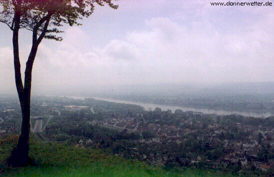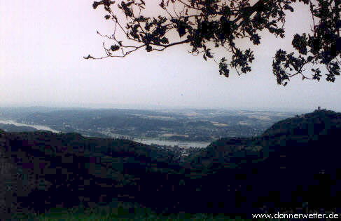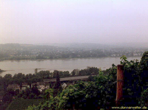 Haufenwolken am Rhein bei schlechter Sicht im Sommer alles grünt