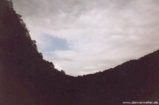 kurz vor einem Regenschauer in einem Talkessel im Gebirge Sommer, Wärme, viel Grün
