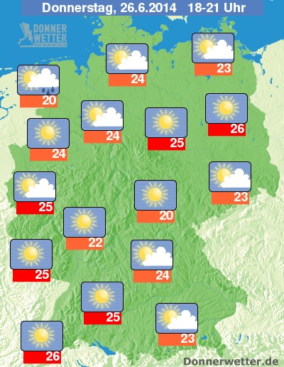 Wie in unserer Prognose für Donnerstag (18 bis 21 Uhr) zu sehen, beschränken sich einzelne Schauer auf den äußersten Nordwesten. Ansonsten gibt es viel Sonnenschein, vereinzelt auch ein paar Wolken. Die Höchstwerte sind mit 20 bis 26 Grad absolut draußentauglich!