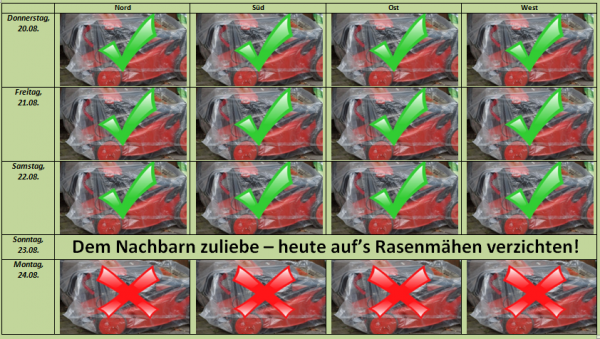 Umso praktischer, dass dem Rasen noch in dieser Woche ein neuer Schnitt verpasst werden kann. Zwischen Donnerstag und Samstag bietet freundliches und vor allem trockenes Spätsommerwetter jede Menge Möglichkeiten, dem wilden Wuchern der Wiese ein Ende zu setzen.