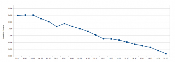 Gut sichtbar wird die Verdunstungsrate in diesem Monat an der oben stehenden Grafik. Die Daten wurden mit einem sogenannten Lysimeter erhoben, mit dem sich die Wasserbilanz eines Bodens sehr genau ermitteln lässt. Hierzu wird ein Stück Boden immer wieder gewogen. Betrug das Gewicht unseres Bodens zu Monatsbeginn noch knapp 8.400 Gramm, lag es am 20.07. bei nur noch 6.140 Gramm.