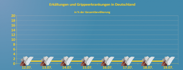 Bis Ende der Woche sind, trotz insgesamt sehr wechselhaften Wetters, nur bis 1% der Bevölkerung von einem Erkältungs- oder Grippeleiden betroffen.