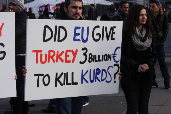 Dieses Plakat drückt es so aus: Unsere Kanzlerin übergab dem türkischen Staatschef Erdogan 3 Milliarden Euro zum "Abschuss der Kurden".
