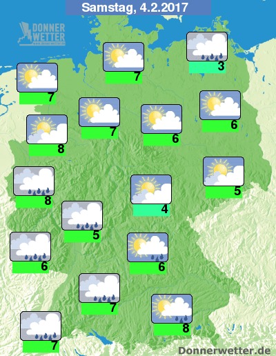 Das erste Februarwochenende (04. / 05.02.) sich dann sehr durchwachsen. Im Westen und Süden regnete es zeitweise, im Nordosten blieb es dagegen meistens trocken. Teilweise war der Himmel hier von einem Wolken- und Nebelvorhang verhangen, gebietsweise schien aber auch die Sonne. Im äußersten Nordosten blieb es mit Werte um 2 Grad C am kühlsten, sonst erreichten die Temperaturen meist zwischen 5 und 10 Grad C.