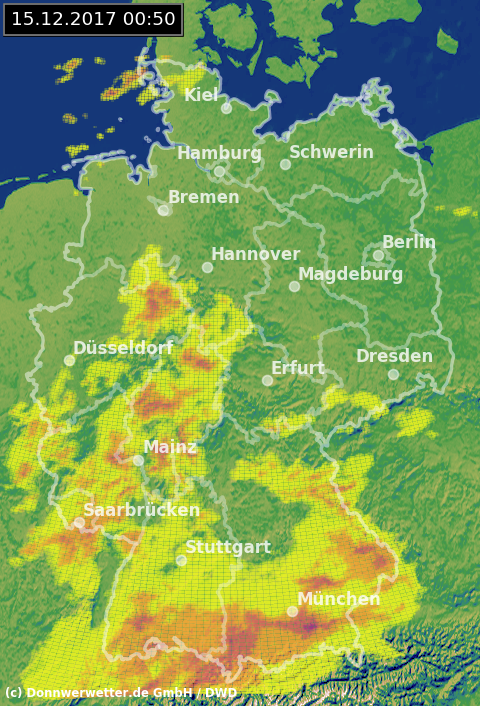 Die Farbe „Grau“ beherrschte am Dienstag (19.12.) das Regiment beim Wetter. Gebietsweise fiel leichter Regen oder Sprühregen, in höheren Lagen der Mittelgebirge und am Abend im Süden teilweise auch Schnee. Nach kalter Nacht im Osten, kletterten die Temperaturen tagsüber auf -1 bis 4 Grad C. Im Nordwesten wurden bereits schon 5 bis 8 Grad C erreicht.