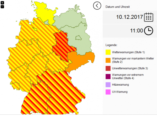 Am Wochenende (16. / 17.12.) wechselten sich In Deutschland an beiden Tagen kurze Auflockerungen und dichtere Wolken miteinander ab. Örtlich traten leichte Regen- und Schneeschauer auf. Die Tageshöchsttemperaturen lagen dabei meist zwischen 1 und 6 Grad C. Auf den Bergen blieb es winterlich. In der Nacht auf Montag setzten im Westen Schnee und Regen ein.