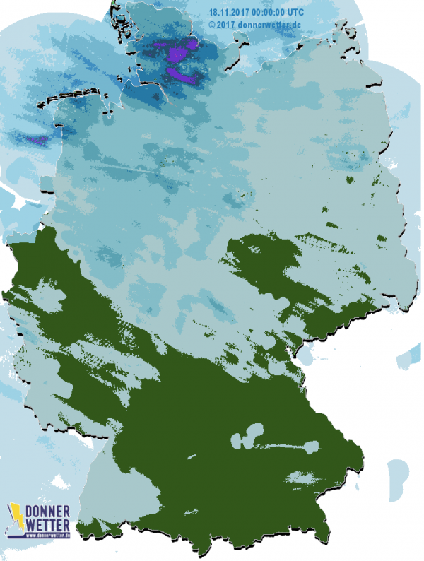 Der Donnerstag (16.11.) zeigt sich dann von seiner trüben Seite, zum Teil war es auch neblig mit etwas Sprühregen. Selten ließ sich die Sonne blicken. Im Süden bewegten sich die Temperaturen zwischen 0 und 7 Grad C, im Norden zwischen 5 und 10 Grad C. Zum Abend hin setzte im Nordwesten leichter Regen ein, dieser erreichte in der Nacht auch die mittleren Landesteile.