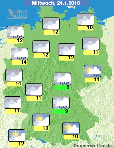 In Süddeutschland sowie südlich von Berlin gab es am Mittwoch (24.01.) größere Aufheiterungen mit längeren sonnigen Abschnitten, sonst sah man sie nur selten durch eine zähe und graue Wolkenpampe hervor schimmern. Dafür tröpfelte oder nieselte es örtlich. Mit Temperaturen von 8 bis 15 Grad C wurde es jedoch für die Jahreszeit sehr mild. Im Laufe des Abends setzte im Nordwesten vermehrt Regen ein. Am Rhein sowie an der Donau herrschte Hochwasser.