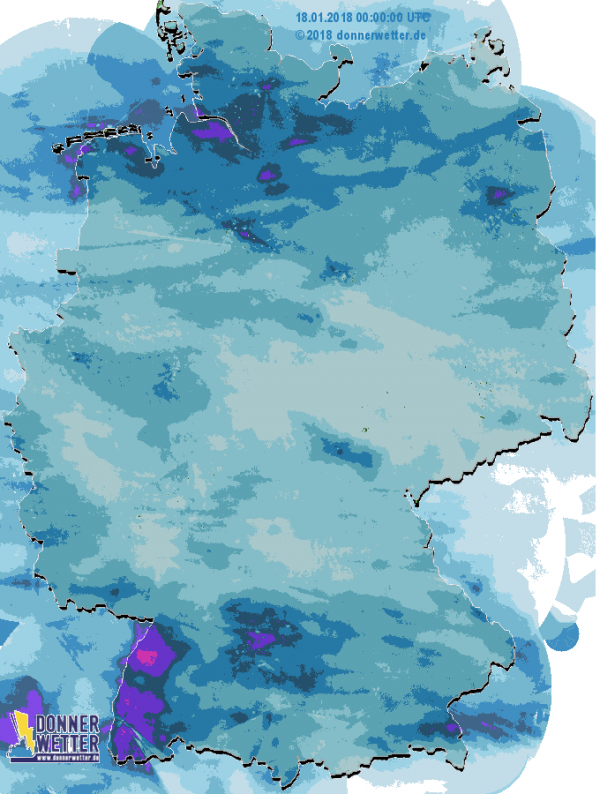 Am Donnerstag (11.01.) zog von Polen ein Regengebiet über den Nordosten und Schleswig-Holstein hinweg und erreichte gegen Abend die Nordsee und Emsmündung. Stellenweise fiel bei Temperaturen im Bereich des Gefrierpunktes sogar gefrierender Regen. Sonst gab es in Deutschland Wolken, Nebel und gebietsweise etwas Sonne bei meist milden 3 bis 10 Grad C, um Stuttgart herum auch bis 12 Grad C.