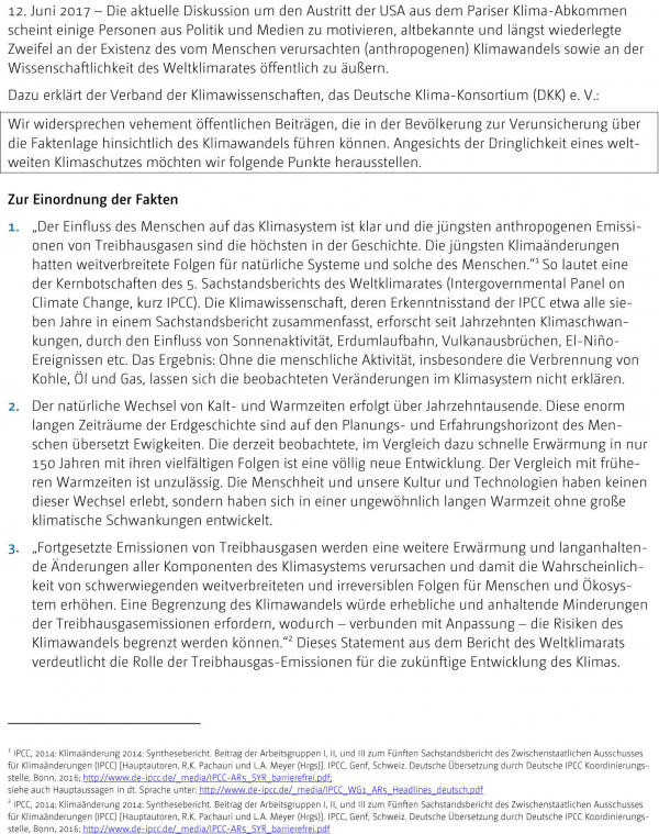 Das DKK bildet nur eine Institution in einem nahezu undurchdringbaren Dschungel an Wissenschaftsverbänden, die sich mit dem Thema Klimawandel befasst. Dennoch weist der Verband in seiner Stellungnahme nochmals auf die unwiderlegbaren Faktenlage hinsichtlich des Klimawandels hin.
