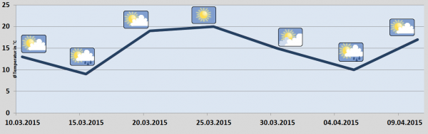 Hochdruck- werden nur kurz von Tiefdruckphasen unterbrochen. Derzeit zeichnet sich eine dreitägige Tiefdruckphase ab, die etwas Regen bringen kann. Zum Monatsende sind dann sogar Temperaturen an die 20 Grad C möglich.