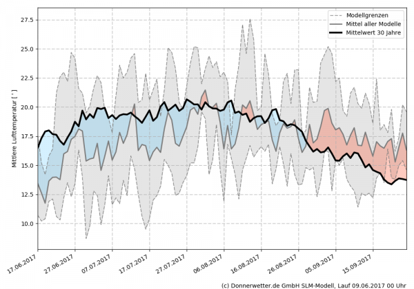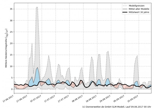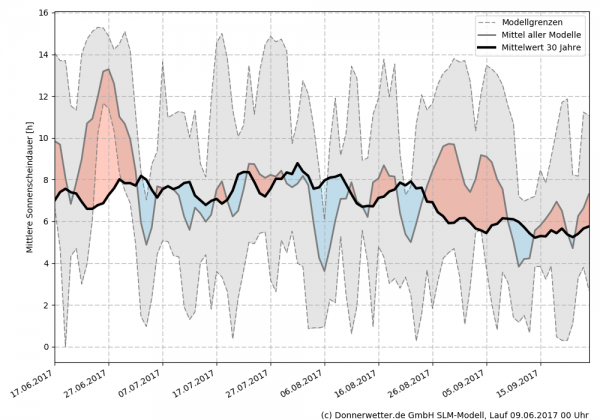 Bewahrheiten sie die aktuellen Berechnungen, steht dem Osten ein insgesamt frischer Sommer bevor. Für längere Zeit deutlich über dem langjährigen Mittel liegen die Temperaturen erst im August. Genau gegenteilig sieht es zur Zeit beim Niederschlag aus, hier berechnen die Modelle überdurchschnittliche Werte. Dafür ist aber die Sonne,  zumindest über weite Teile des Sommers, auf der Seite der Ostdeutschen. Die mittlere Sonnenscheindauer liegt vor allem in der zweiten Junihälfte sowie im August über dem 30-Jahres-Mittel.