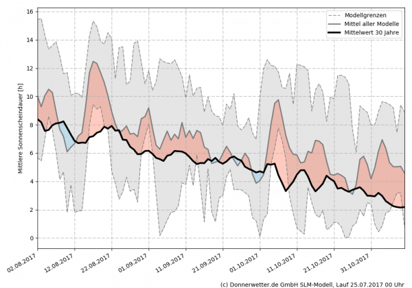 So berechnet unser Langfristmodell aktuell nicht nur die mittlere Lufttemperatur mit überdurchschnittlichen Werten, auch die Sonnenscheindauer könnte uns für die Wettereskapaden im Juli entschädigen. Mit vielen schönen Spätsommerphasen ist vor allem ab Mitte / Ende August zu rechnen.