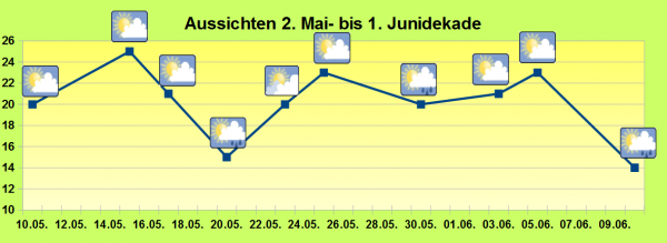 Schluss mit schönem Wetter ist danach aber noch lange nicht. Bis über die Monatsmitte des Mai hinweg bestimmen Hochdrucklagen häufig unser Wetterbild.