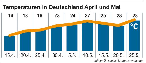Einen Hauch von Sommer versprüht dann aber der Mai: Die Temperaturen klettern dann mit häufig sonnigem Wetter bereits an mehreren Tagen über die 25-Grad-Marke.