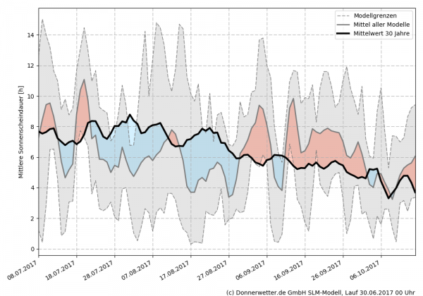 Auch im Osten geht es zwar eher wechselhaft in den neuen Monat, Regenmengen wie am Donnerstag und Freitag sind aber vorerst nicht mehr zu erwarten. Stattdessen bleibt es im neuen Monat über weite Strecken bei eher gemäßigten Julitemperaturen, eine Trendwende deutet sich nach wie vor erst im August an. Welche Abweichungen unsere Modelle in Hinblick auf Temperatur, Niederschlag und Sonnenscheindauer sehen, zeigen die nachfolgenden Grafiken.