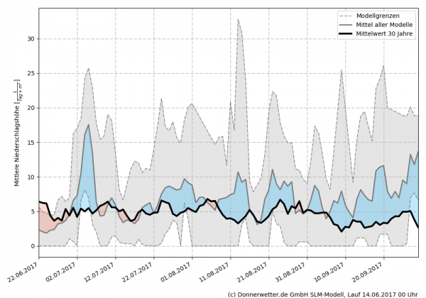 Auch in der Südhälfte sieht es nach wie vor nach einem insgesamt zu kühlen Sommer 2017 aus, zudem liegen die zu erwartenden Niederschlagsmengen meist über dem 30-Jahres-Mittel. Die Sonnenscheindauer zeigt sich über die Sommermonate weiterhin launisch, die sonnigsten Phasen erwarten uns zwischen Ende Juni und Anfang Juli sowie ab Ende August.