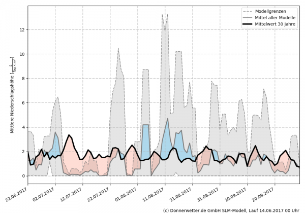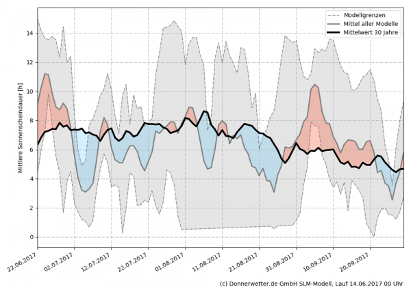 Von den Temperaturen her blüht uns 2017 auch weiterhin kein Extremsommer - über weite Teile liegen die mittleren Lufttemperaturen unter dem langjährigen Durchschnitt. Verregnetes Wetter verhagelt uns jedoch nur selten die Sommerlaune, vor allem im Juli liegen die mittleren Regenmengen unter dem Durchschnitt. Ein Auf und Ab ist bei der Sonnenscheindauer zu beobachten - als besonders sonnig deutet sich neben der zweiten Junihälfte zudem der Zeitraum ab Ende August an.