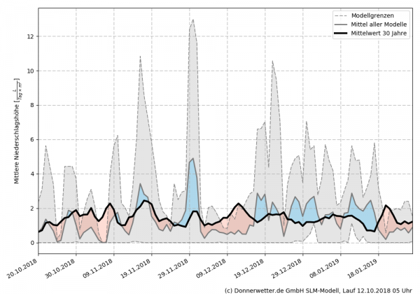 Im Osten sieht es ein wenig besser aus. Denn die roten Flächen bei den Lufttemperaturen bedeuten eine Tendenz zu wärmeren Tagen. Das schließen wir aus den Berechnungen der letzten Jahre. Auch die Sonnenscheindauer zeigt dennoch einen schwachen Start in den Monat November. Dennoch kein Grund trübsal zu blasen denn die Niederschlagswerte liegen im langjährigen Mittelwert.